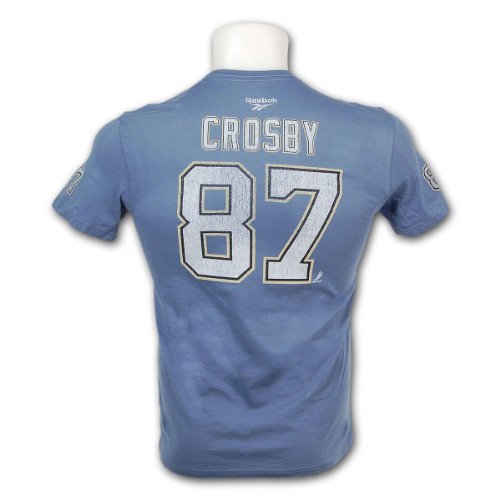 Pittsburgh Penguins Sidney Crosby Player Name & Number Retro T-Shirt The Player Name & Number Tee by Reebok features: - 100% soft cotton slim fitted team colored t-shirt - Vintage Team distressed logo screened to front chest - Player name and number distressed print on the back - Player number distressed printed to both sleeves